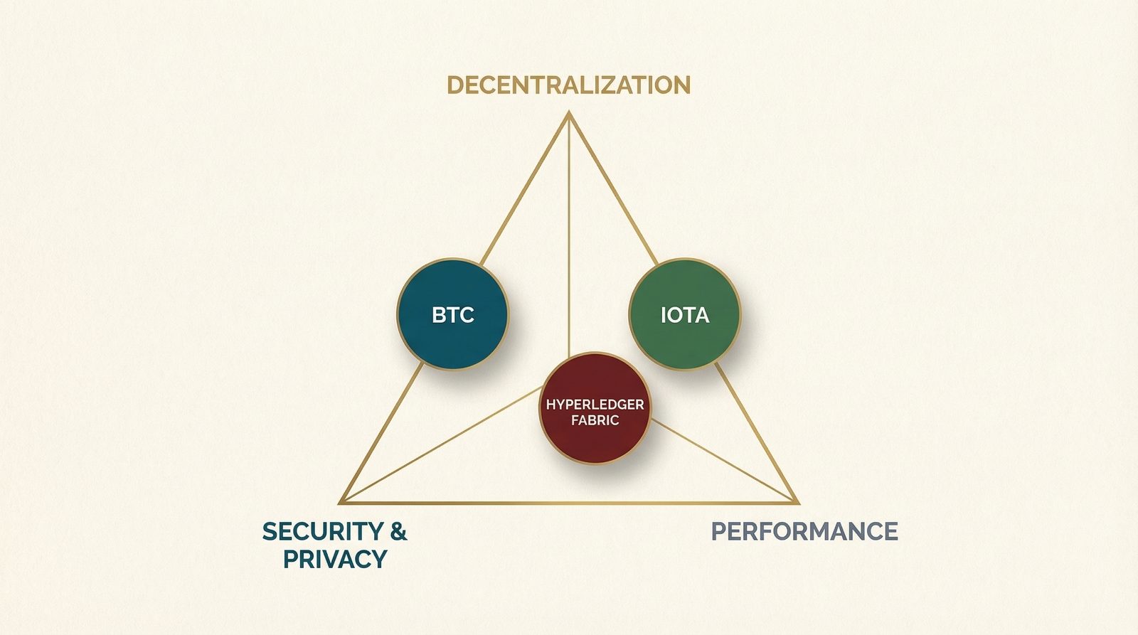 The survey's other enduring idea is its trade-off framing. DLT systems are often sold as if they can maximize decentralization, strong security, and high performance at the same time. The paper insists that real systems do not get that luxury, especially not on resource-constrained IoT deployments.