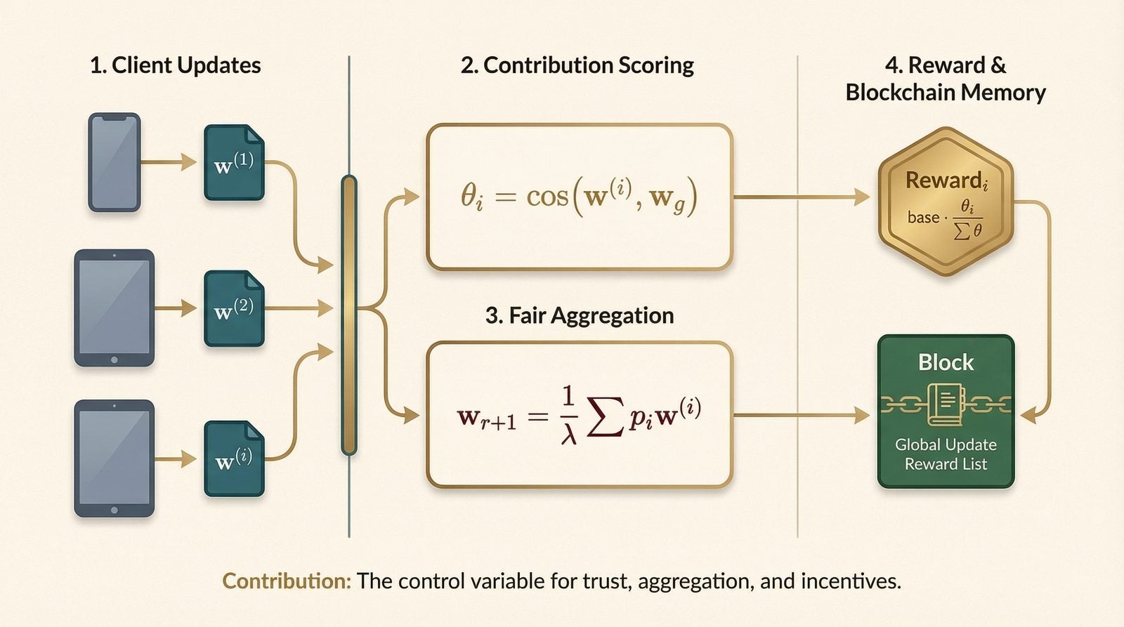 It treats fairness as a systems primitive. The same quantity that decides who gets rewarded also decides whose gradients should shape the next global model.