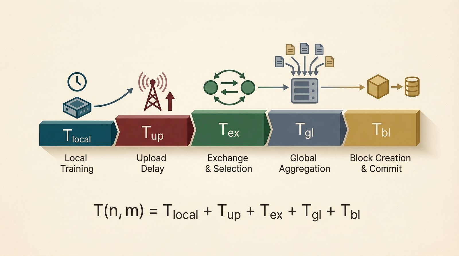 The coordination stack matters. The paper models total delay as a sum of local training, upload, exchange, aggregation, and block commitment.